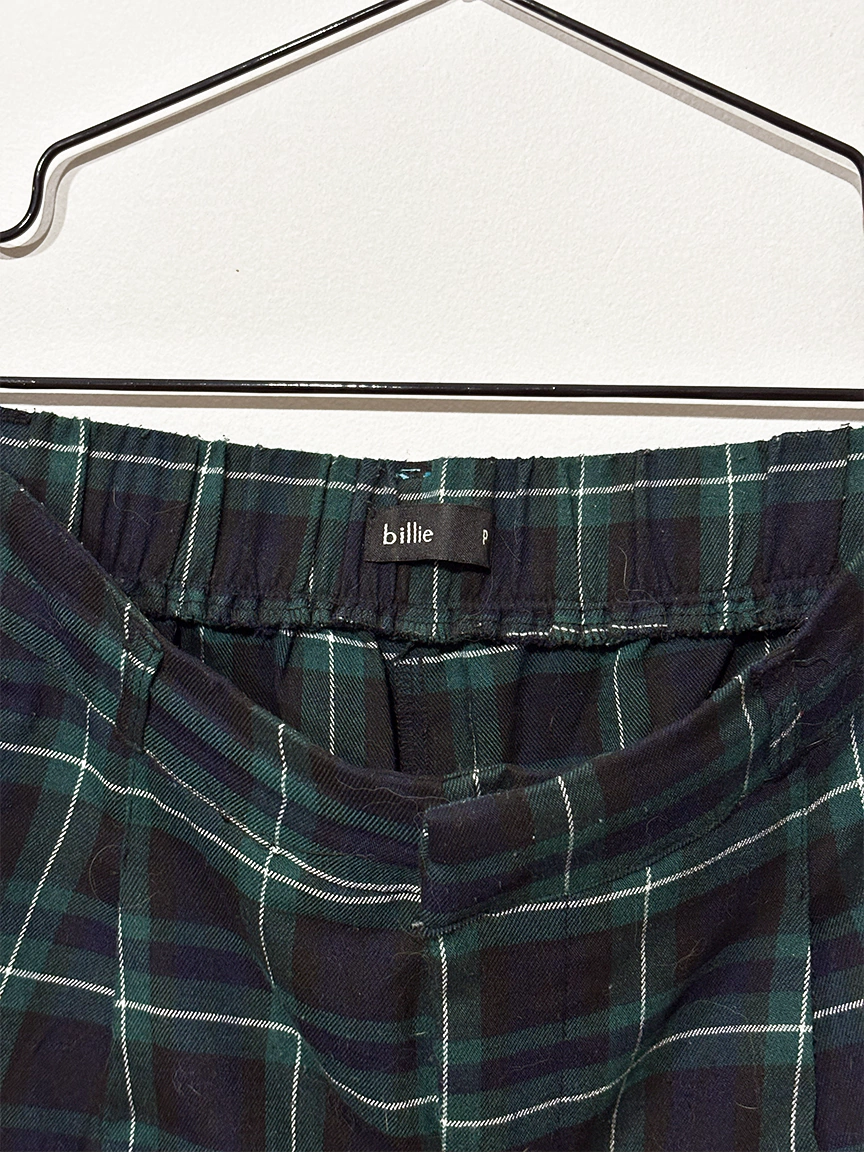 Calça reta com estampa xadrez em tons de azul e verde escuro, de cintura média com elástico na parte de trás, ficando mais acinturadinha e confortável.